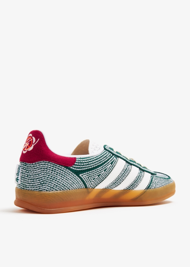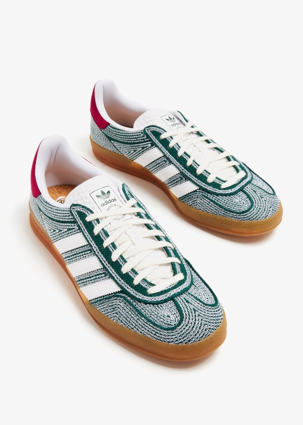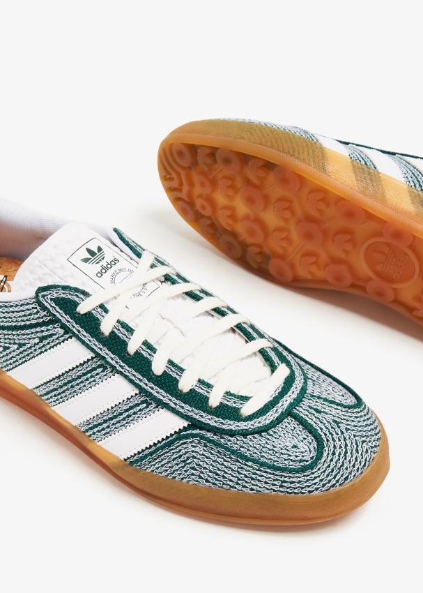 تتعاون أديداس مع شون وذرسبون لتُعيد تقديم سنيكرز جازيل اندور الشهير بنعل مطاطي مع مقدمة على شكل حرف "T"، خطوط ولسان باللون الأبيض وملصق بشعار العلامة.