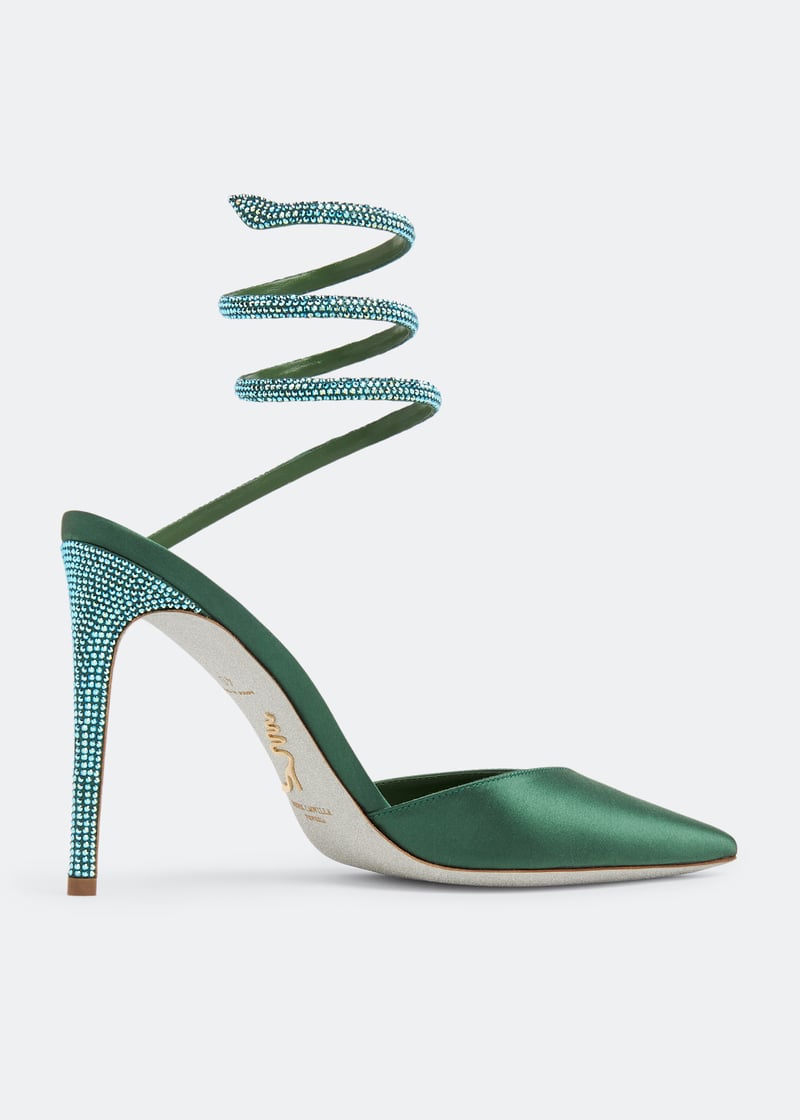 يتميز حذاء كليو عالي الكعب من رينيه كاوفيلا ببنية من الساتان الفاخر مع مقدمة مدببة، حواف مرصعة بالكريستال، حزام الكاحل اللولبي الشهير مع حِلية رأس الثعبان. نسقيه مع بنطال جينز قصير أو فساتين قصيرة لإبراز جماله.